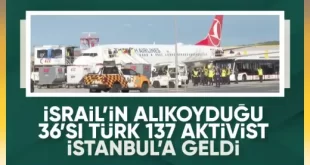 İsrail’in yasa dışı şekilde alıkoyduğu Küresel Sumud Filosu’ndaki 36’sı Türk 137 aktivist, İstanbul Havalimanı’na ulaştı. İsrail, ablukayı kırmak ve insani yardım ulaştırmak amacıyla günlerdir Gazze’ye yol alan Küresel Sumud Filosu’na 1 Ekim akşamında müdahalede bulunmuştu. 46 ülkeden 497 aktivistin bulunduğu filoya, uluslararası sularda seyrederken müdahalede bulunan İsrail, gemileri ve içlerinde …